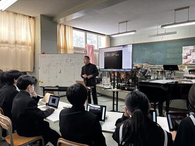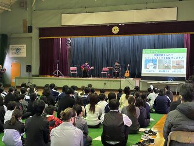 11月26日の新しい学校づくり授業⑦は、「学園の校歌お披露目会&なかとんミーティング地域版」として、作詞作曲を担当してくださった、chimaさんと成山剛さんをお迎えし、お披露目会を行いました。