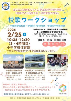 2月25日(水)に2月の学校づくりは、新中頓別学園校歌を作詞作曲のchimaさん、成山剛さんと一緒に、年長さん(新1年生)~中3まで全児童生徒で合唱します。