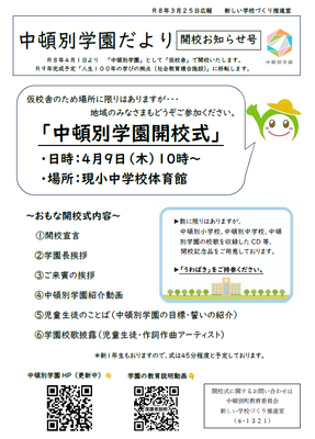 また、本日25日配布の広報お知らせ版で、「開校式のご案内」を町内の皆様にも配布しております。ぜひご参加ください。(駐車場が狭いので、お近くの方は徒歩、または乗り合わせでご来校いただければと思います。)