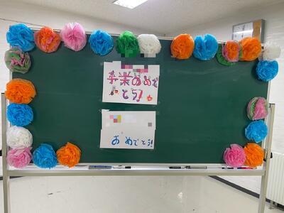 教育長から一人一人卒級証を、在校生から花束をもらい、保護者や関係者が見守る中、「笑顔・涙」の卒業式を行うことができました。