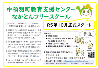 令和8年度からは、専門教職員、SC(スクールカウンセラー)、フリースクール応援スタッフだけでなく、SSW(スクールソーシャルワーカー)も配置し、こども園、中頓別学園・教育支援センター・フリースクール(令和9年度より同施設)を巡回しながら、一人一人の良さを伸ばし、学校と家庭を支えるサポート体制を整えていきます。引き続きご活用ください。