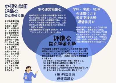 また、将来的に、社会教育複合施設での学校運営となるため、R8年度には「(仮)中頓別学園評議会準備委員会」を組織し、R9年度より「(仮)中頓別学園評議会」の設置に向けて、学校運営に関わる様々な組織を学校規模に合わせ、再編・統合していく方向性も、教育長より示されました。